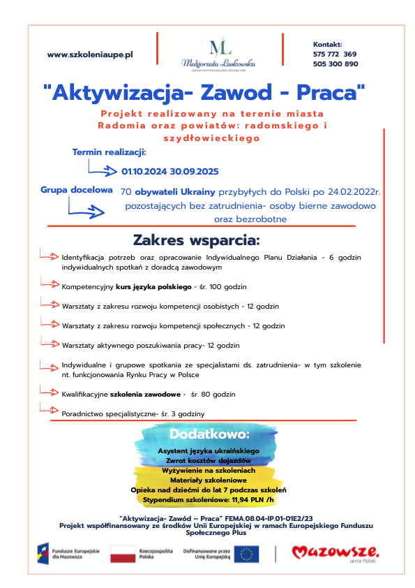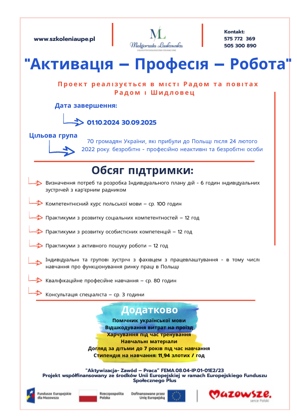 Cel główny projektu:  Zwiększenie możliwości uzyskania i utrzymania zatrudnienia wśród 70 osób (60K i 10M) obywateli Ukrainy przybyłych do Polski po 24 lutego 2022 r., zamieszkujących na obszarze RMR, tj. w m. Radom, pow. radomskim i pow. szydłowieckim, poprzez kompleksowe i indywidualne wsparci aktywizacyjne,