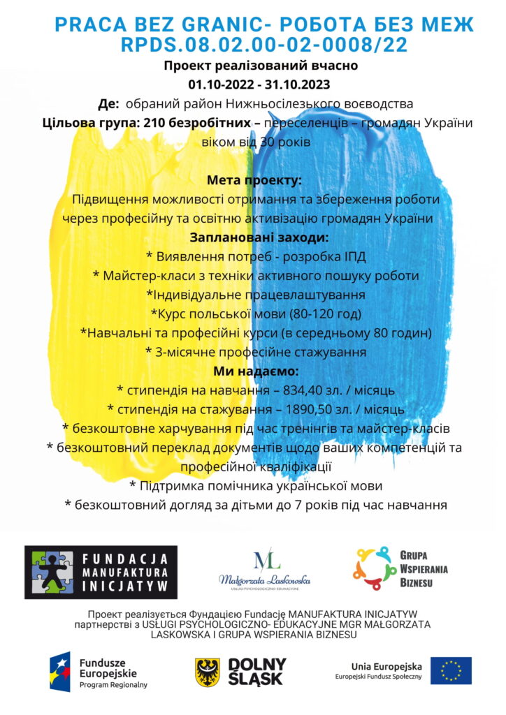 Projekt pn. „PRACA BEZ GRANIC” nr RPDS.08.02.00-02-0008/22 realizowany w ramach Regionalnego Programu Operacyjnego Województwa Dolnośląskiego 2014-2020 współfinansowanego z Europejskiego Funduszu Społecznego