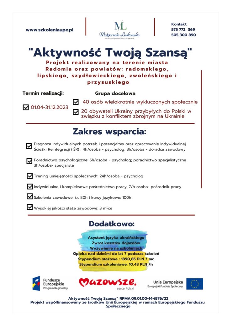 Cel projektu: podniesienie poziomu aktywności społecznej wśród min 34% osób spośród 60 osób (42K,18M), w tym 40os./24K zagrożonych ubóstwem lub wykluczeniem społecznym oraz 20os./18K obywateli Ukrainy w rozumieniu ustawy z dn. 12 marca 2022 r. o pomocy obywatelom Ukrainy w związku z konfliktem zbrojnym na terytorium tego państwa, zamieszkujących na terenie m. Radomia, powiatu radomskiego, szydłowieckiego, lipskiego, zwoleńskiego i przysuskiego w woj. mazowieckim oraz podjęcie zatrudnienia przez min. 15 osób z ww. grupy docelowej, dzięki kompleksowemu wsparciu w postaci usług aktywnej integracji
