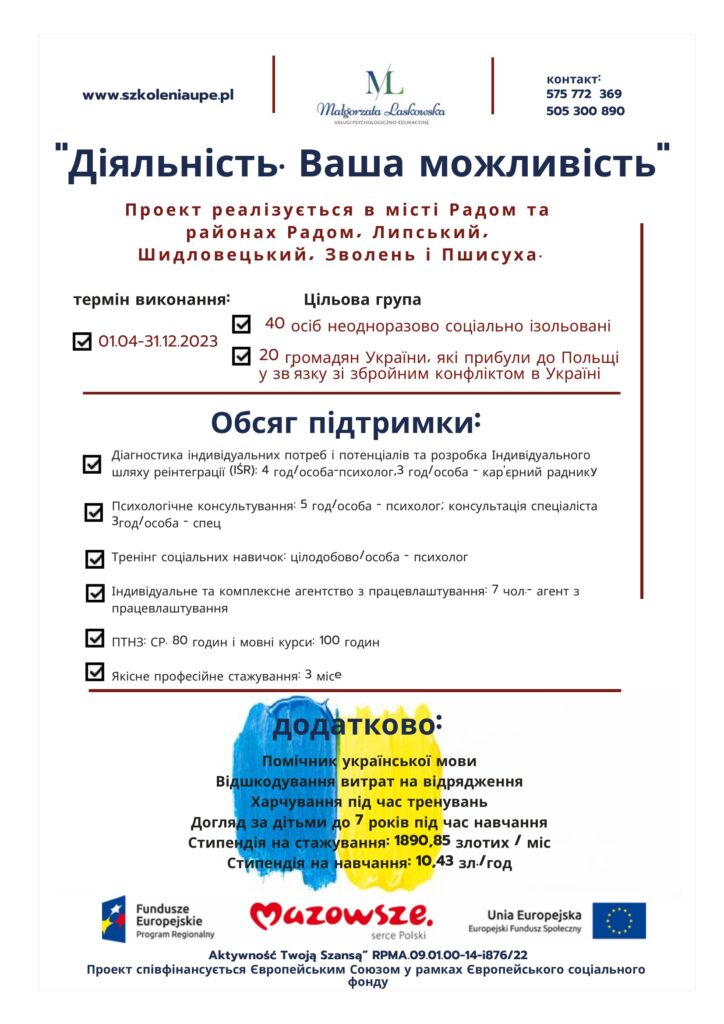 Projekt skierowany do osób powyżej 30 roku życia zamieszkujących na terenie województwa dolnośląskiego, pozostających bez zatrudnienia, które przybyły na terytorium Rzeczpospolitej Polskiej w związku z działaniami wojennymi prowadzonymi na terenie Ukrainy.